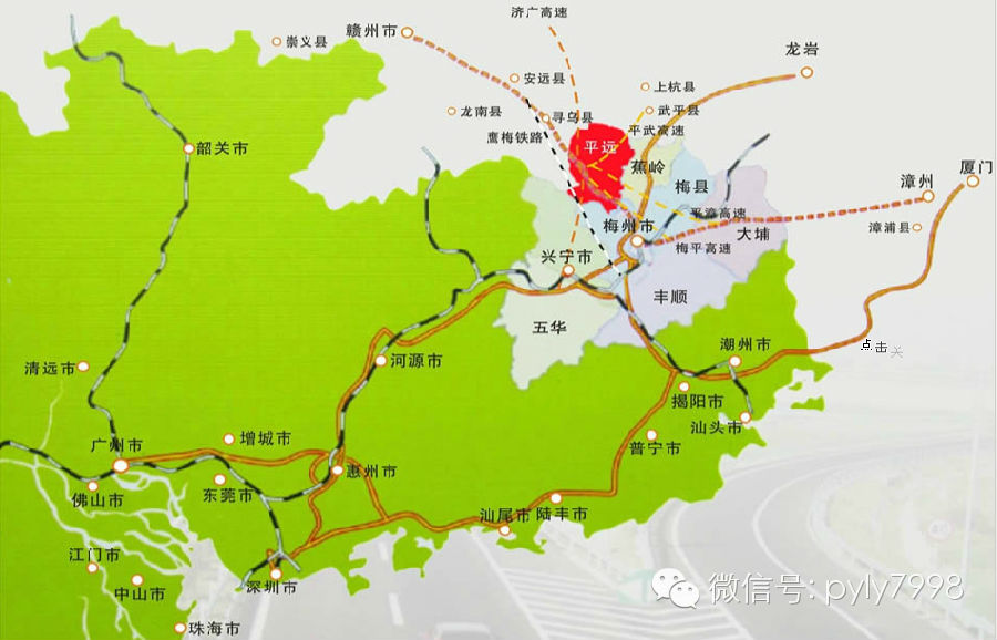 龙岩—夏蓉高速(62公里)—长深高速(149公里)—梅州—206国道(38公里)—平远