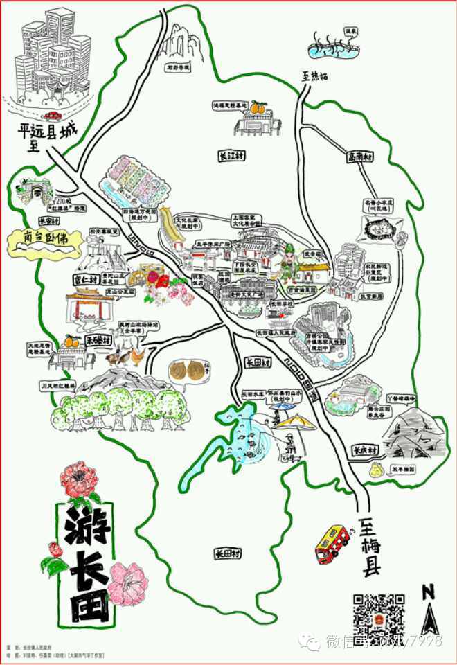 平远长田以花为媒,以节会友,形成富有当地特色的文化旅游品牌,最大限度地引客入平、把客留下。下图为平远长田手绘地图和特色农家乐,供自驾游客参考 。