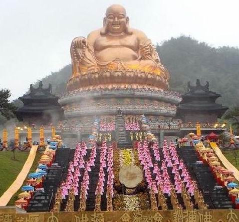 浙江奉化溪口雪窦山露天弥勒大佛是典型的中国化弥勒佛像。佛像具有比丘相,罗汉身,菩萨意,布袋形,佛之像。大佛用500多吨锡青铜铸造,佛像身高33米,表示弥勒身居33层天;莲花座高9米,另加基座14.74米,共56.74米。