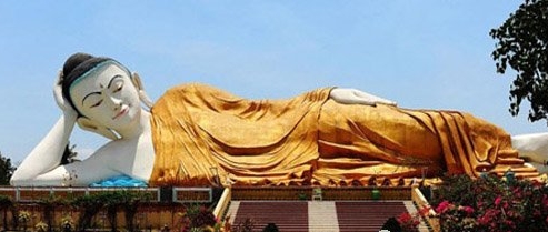 缅甸乔达基卧佛是缅甸最大卧佛像,约65公尺长、17公尺高,甚为巨型。佛像为白色实心,眼睛则由玻璃镶嵌而成,可谓栩栩如生。其中卧佛右手轻倚头部,彷彿正慈悲注视身下的人们。更特别的是卧佛脚底有108个佛足图案,表示佛家三界的:欲界、色界与无色界,除能象征人类轮回的次数外,亦表示天地万物皆于佛佗脚下。