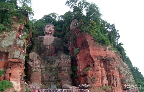 四川的乐山大佛,位于峨眉山东31公里的乐山市,依凌云山栖霞峰临江峭壁凿造而成,又名凌云大佛。佛像高71m,佛头长14.7m,头宽10m,肩宽24m,耳长7m,耳内可并立二人,脚背宽8.5米,可坐百余人。