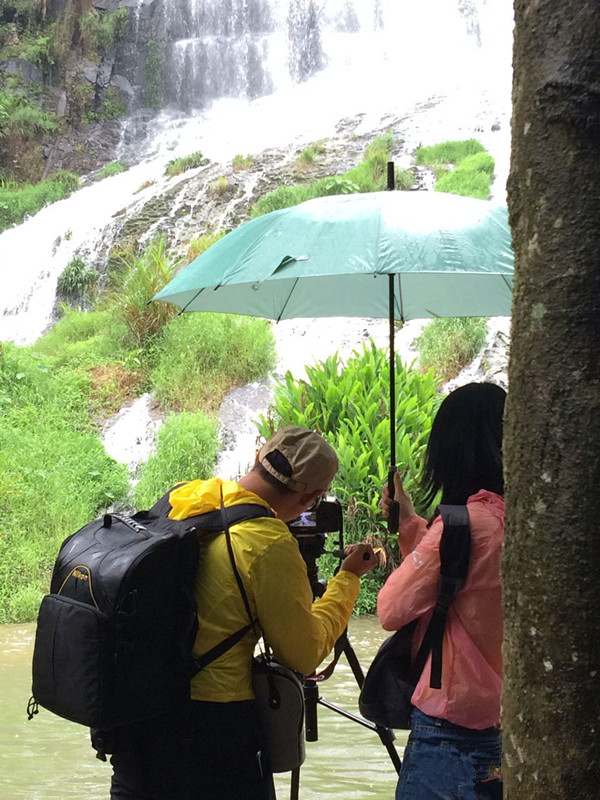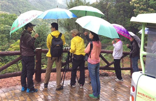 5月6日,林建平一行先后深入到五指石天道、核心景区和相思河等地进行取景拍摄,五指美景让他们流连忘返。穿过春意盎然的贵妃谷,摄制组立即被这条“天然花巷”所吸引,一拍就是一个多钟。雨后的贵妃谷雨水充沛,两岸的石壁不时有水珠滴落,有些地方甚至形成了小瀑布,构成了一道奇特的晴天雨景。粉色的石海棠攀满了苍翠的石壁,放眼望去,峡谷两旁尽是粉红的花潮。石壁上方是迎风招展的野百合,它们纷纷伸展起白色的号角状花朵,洁白的花瓣在水珠的映衬在更显清新,秒杀了摄制组的不少镜头。走上天道,原生态的森林景观尽收眼底,丹霞峭壁像是被无数人工巨斧雕琢过一样,留下不少让人遐想连篇的作品。面对众多的奇山奇石,摄制组直呼奇特,恨不得将这番景象尽收在镜头里面。在核心景区,面对参天古木和各种纠缠着的奇藤奇树,摄制组赞叹不已。泛舟相思河,嶙峋的山石、古老的石桥和苍翠的树木交相辉映,宛如进入了一幅烟雨江南的画面,让人不忍离去。第二天摄制组转至上举相思谷景区进行拍摄。