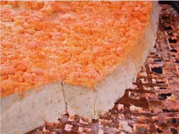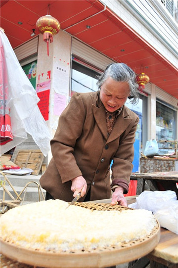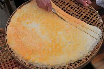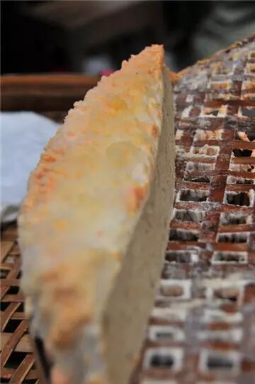 ●传说归传说,但红菌豆腐头确实是用豆腐渣制作的。仁居人取新鲜的豆腐渣,放在锅里用文火不断翻炒,炒到豆腐渣干至手捏成团没有水影为止,便将它铲到垫好豆头叶(又叫“大枫叶”)或梧桐叶、芭蕉叶的簸箕里,稍凉后用锅铲耙平慢慢压实,然后将先做过的红菌豆腐红菌作“菌娘”(菌娘又叫菌种,有红的较快的作用,没有也可以生红菌),第一段工序便完成。