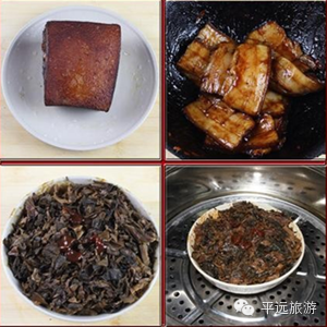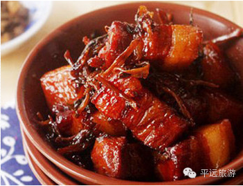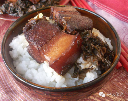 ◆梅菜扣肉:将晾晒好的芥菜干,切成寸条状,将肉洗净,切成块(最好为带皮五花肉)。拌以母子酱油、味精,待肉吸收酱油后,按一层菜,一层肉铺好,放在蒸笼里蒸一小时左右,肉已酥软,带有干菜清香,吃起来酥而不腻,干菜油光光,鲜而不咸,“过饭”极好。