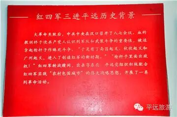 1929年11月到1930年5月间,中国工农红军第四军为拱卫毛泽东和筹粮筹款,在朱德、陈毅等将领率领下三次进军平远,播撒革命火种、开展武装斗争、建立红色政权,平远成为中央苏区的“南部屏障”,发挥着“红色港湾”作用。