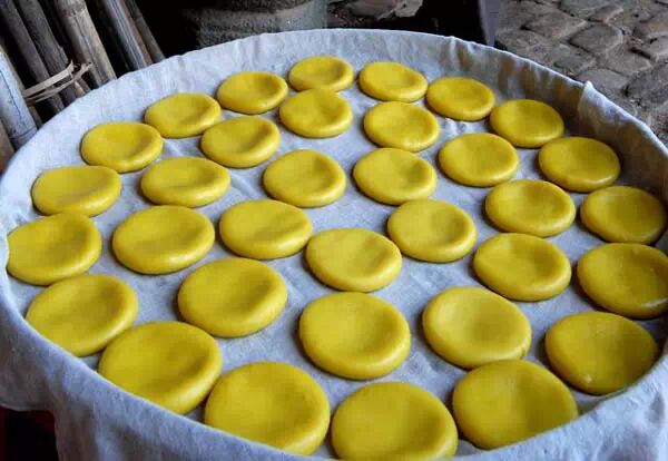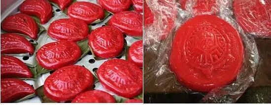 红粄,顾名思义,非常红。。。红粄,用糯米、粘米和红曲作成。讲究一点的红粄,是以暗喻吉祥的动植物为模板,尤其以正面是龟甲,背面是桃子的模子最普遍。因为作成龟甲和寿桃的红粄,是除夕清晨拜天公、祭祀祖先,以及取媳妇、作寿、庙会敬神等,供桌上常用的供品。