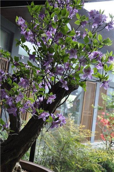在博物馆室内,绚烂的杜鹃越发显出古木的深沉厚重,伴着靓丽的色彩欣赏馆内的古木珍品也是别有一番韵味。
