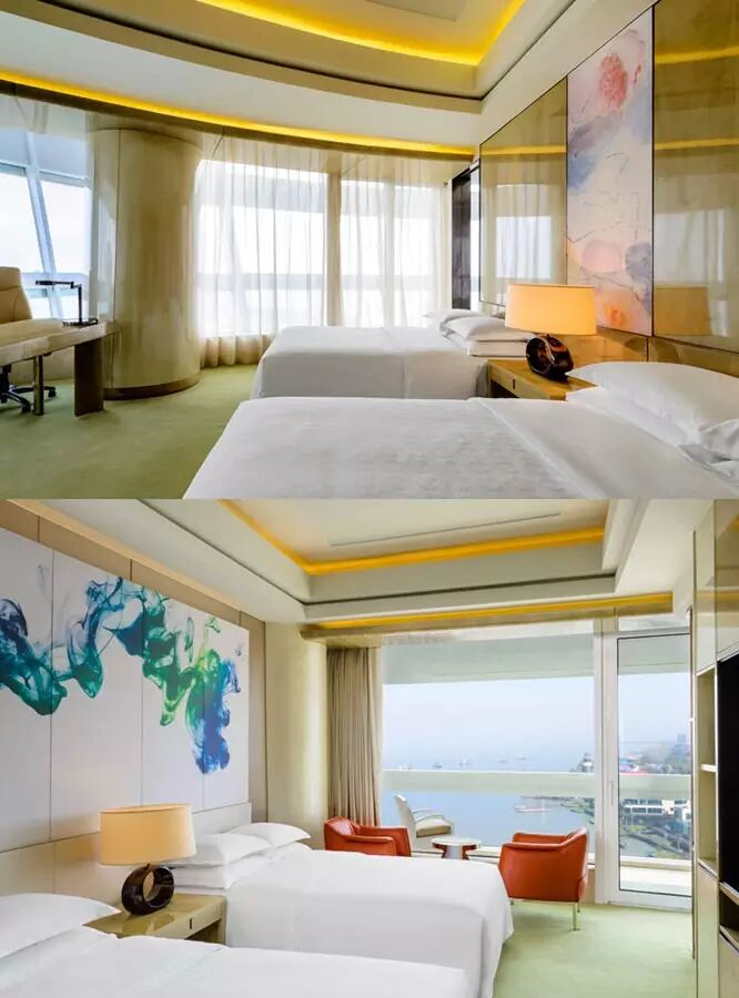 下图上面的就是顶级客房双人床房,下面的是豪华套房,看太湖美景都是360度无死角。