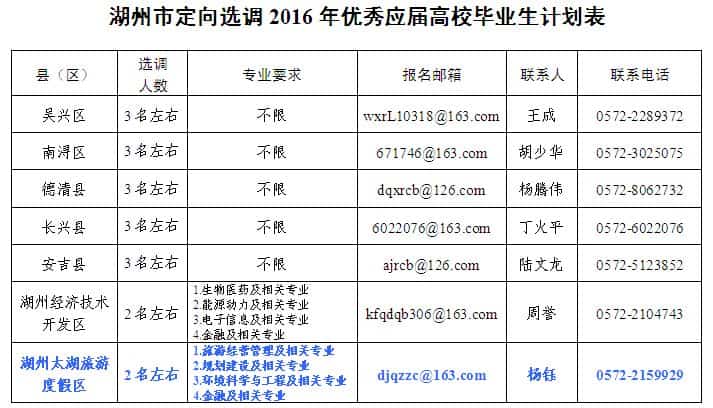 报名方式:采用网上报名方式进行报名,报名者从公告附件中下载报名表,填写《湖州市定向选调2016年优秀应届高校毕业生报名表》(附件2),并连同二寸免冠照片及学校出具的学生干部证明材料(需盖章)以电子文档(电子照片)形式发送至报名电子邮箱(不得同时向2个及以上县区报名),邮件主题请注明:选调2016年优秀应届高校毕业生,报名邮箱详见计划表。