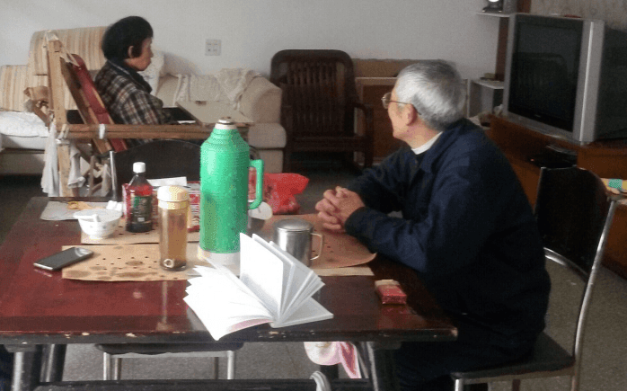 2012年的一次交通事故改变了吴阿江本来还算平静安逸的生活。当时,吴阿江的老伴吴根珠在太湖路金家兜路口出了严重车祸,被江苏一外来人的摩托车撞伤,经过医院及时抢救,生命是保住了,但脑部开了三刀,大脑严重受损,出院后,吴根珠生活不能自理,语言能力基本丧失,精神失常,大小便失禁,形同植物人。三年多时间来,由于吴根珠大小便失禁,吴阿江每晚要给她换两块尿布,特别是到了冬天,出去活动得少,吃喝拉撒都在床上,多的时候一天要换10块尿布。吴阿江每天至少要帮老伴翻一次身、擦一次身,以免生疮。他还特意为老伴打造了一架特制的轮椅,天气好的时候就陪老伴到廊前呼吸一下新鲜空气。可以说照顾得无微不至,两人的房间里更是收拾得特别干净整齐,没有一点味道。