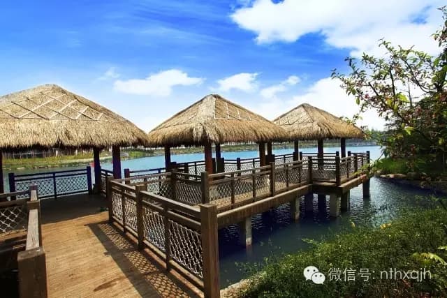 古朴自然的建筑风格,茅草屋、木栏杆、竹制躺椅……一派天然风趣。
