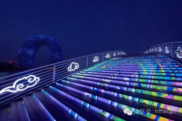 ▲夜晚一家人漫步月亮广场,沿着渔人码头行走,看最美的南太湖夜景。月亮酒店那美轮美奂的灯光秀和百变造型、广场上那梦幻的音乐喷泉、浪漫月亮桥上那对开屏的孔雀……是展示南太湖风韵与气质的全新旅程。