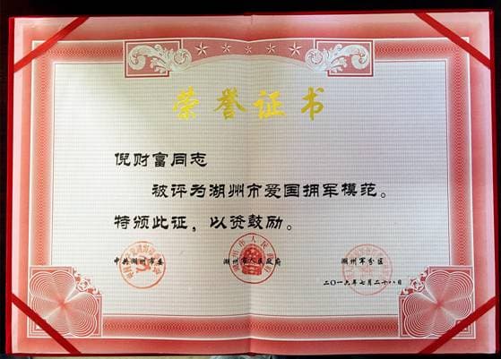 倪财富被评为“湖州市爱国拥军模范”后,面对如此之高的政治荣誉,他拥军的热情更高了、劲头更足了,他说:“关心国防就是关心我们的家园,只有我们自觉、自愿的拥军,才是真正意义上的拥军。”